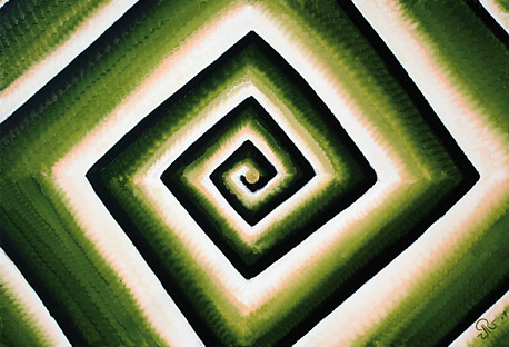 Gemütszustände gebunden an Stufen, welche mögliche Schwankungen symbolisieren. Das starke geometrische Design resultiert in dynamischen optischen Effekten. Der Goldene Punkt in der Mitte, stabilisiert. Die Betrachter können selber entscheiden, ob die Treppen hoch oder runter führen.