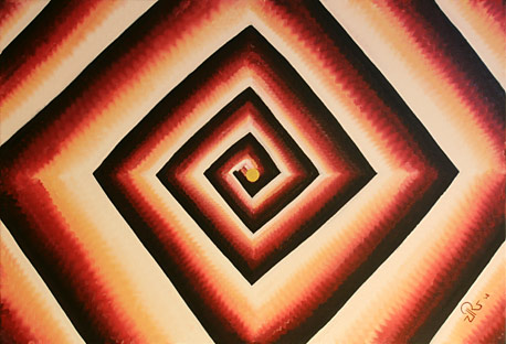 Gemütszustände gebunden an Stufen, welche mögliche Schwankungen symbolisieren. Das starke geometrische Design resultiert in dynamischen optischen Effekten. Der Goldene Punkt in der Mitte, stabilisiert. Die Betrachter können selber entscheiden, ob die Treppen hoch oder runter führen.